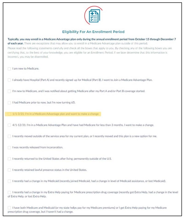 Please note that this is the same option to use for those currently on a Medicare Advantage plan that are shopping for new plans during Open Enrollment Period (January 1- March 31).