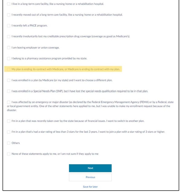 For SEP #2, where Humana is no longer available as a plan option, please select the option "My plan is ending its contract with Medicare, or Medicare is ending its contract with my plan" as shown below.